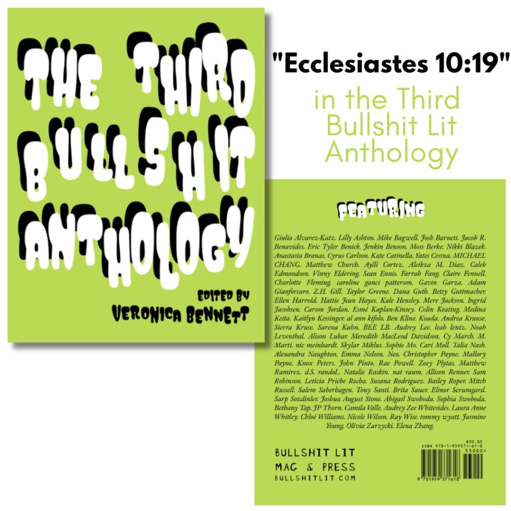 I had a short story published in the Third Bullshit Lit Anthology: “Ecclesiastes 10:19.”