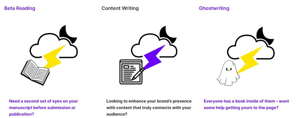 If you need help polishing your work (flash fiction, short stories, novels – I do it all!), getting your ideas on the page, or marketing yourself or your book, I’m here to help!