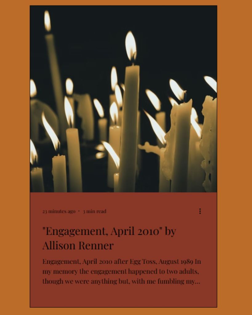 I wrote this in Nancy Stohlman’s “Courting the Muse” workshop back in May 2023. We were asked to “plunder” another writer or story, studying what we loved about it and then trying to emulate that in our own work. I love “Egg Toss, August 1989” by Meagan Cass, so that was clearly my inspiration here!