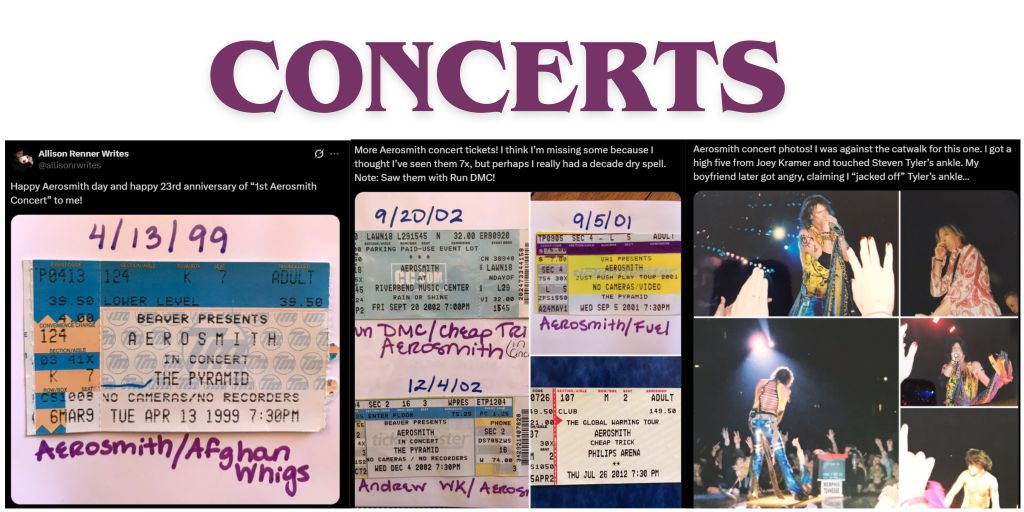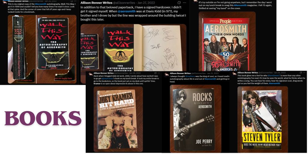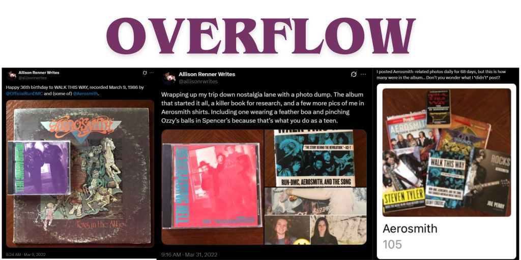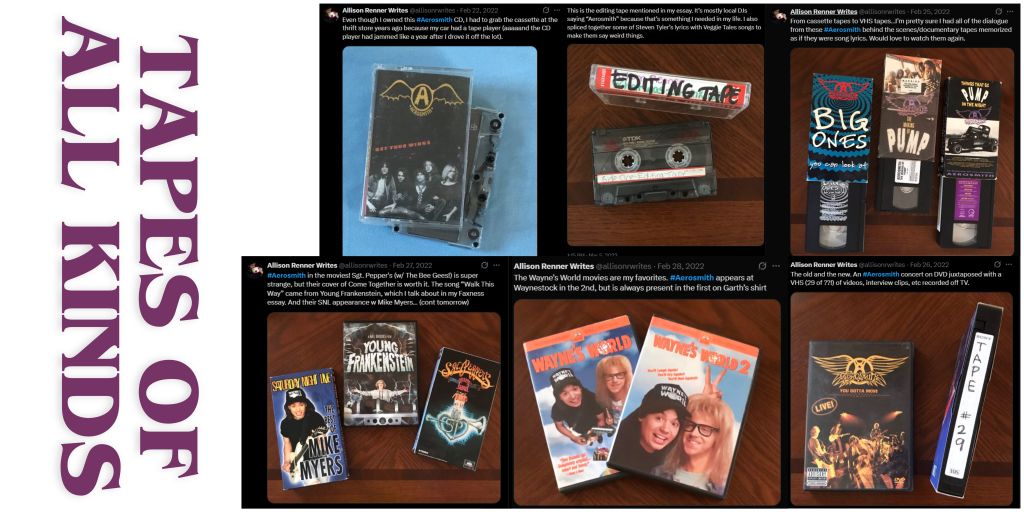 Despite owning every album, I listened to the classic rock stations and recorded the tail end of Aerosmith songs. I wanted to hear the DJ say “Aerosmith” because it gave me a thrill—that’s my band! I eventually utilized the dual cassettes of my stereo to record each mention of Aerosmith onto its own compilation tape. Because obsessing is what you do when you’re thirteen and in love for the first time.